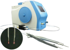 レーザー光を2本に分岐することで両側からのレーザー照射が行え、より速く、より強力な切開・剥離・血管処理が可能です。 |