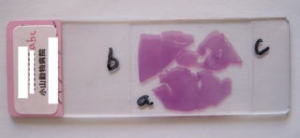 非常に薄い腫瘍の割面(スライス面)で、スライド標本を作成し、顕微鏡にて観察します。 |