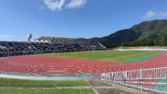 13時5分に出雲大社前をスタートし、そのまま一路南へ。30分ほど歩くと、道路標示で浜山公園は左折となっていましたので、そこで左折。 その後10分ほど歩くと高校野球で有名な大社高校があり、そこから坂を登ると島根県立浜山公園はありました。 通常の球場だけでなく、少年野球用の球場、陸上競技場がメインとサブの2つ、球技場、体育館、テニスコートにゲートボール場までありました。 ちなみにこの陸上競技場は「もうひとつの出雲駅伝」としても知られる出雲市陸協記録会の会場になっています。